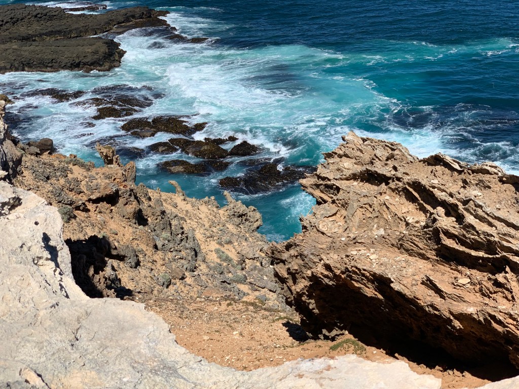 I wasn’t expecting the strange topography. It’s like a lunar landscape consisting of sharp limestone bleached and eroded by saltwater. The waves pounding below compound a sinister uneasy feeling – I don’t feel safe.