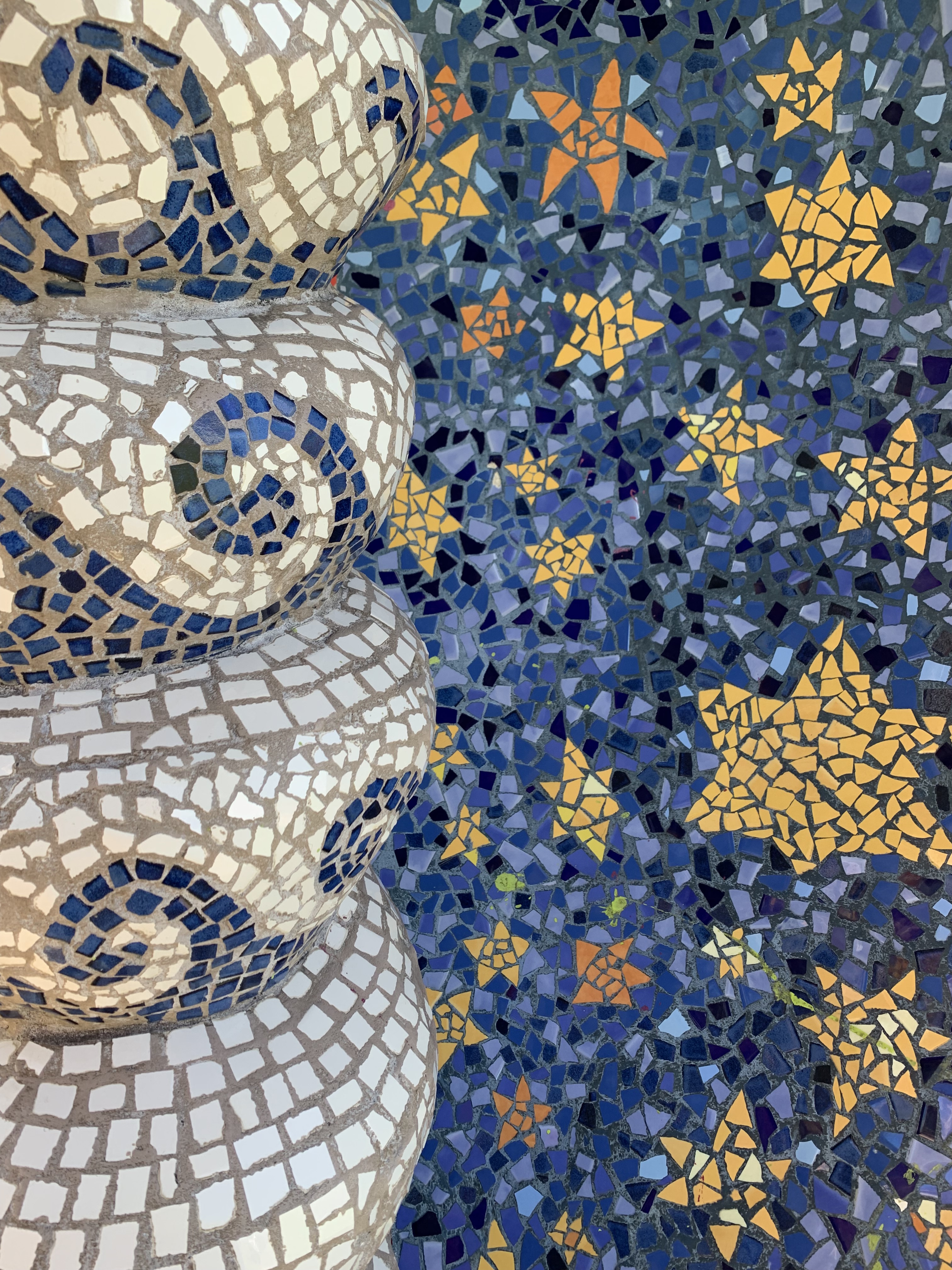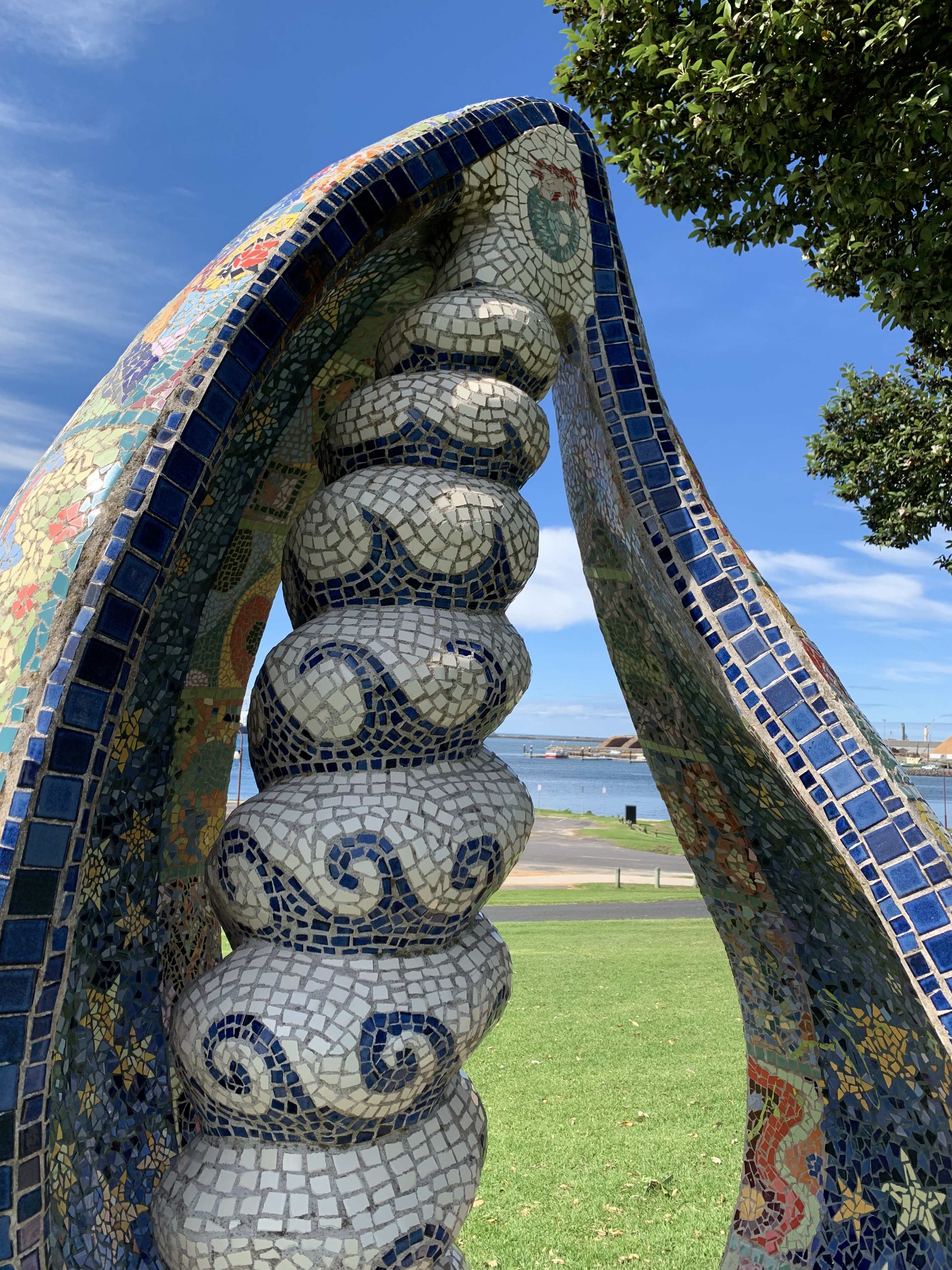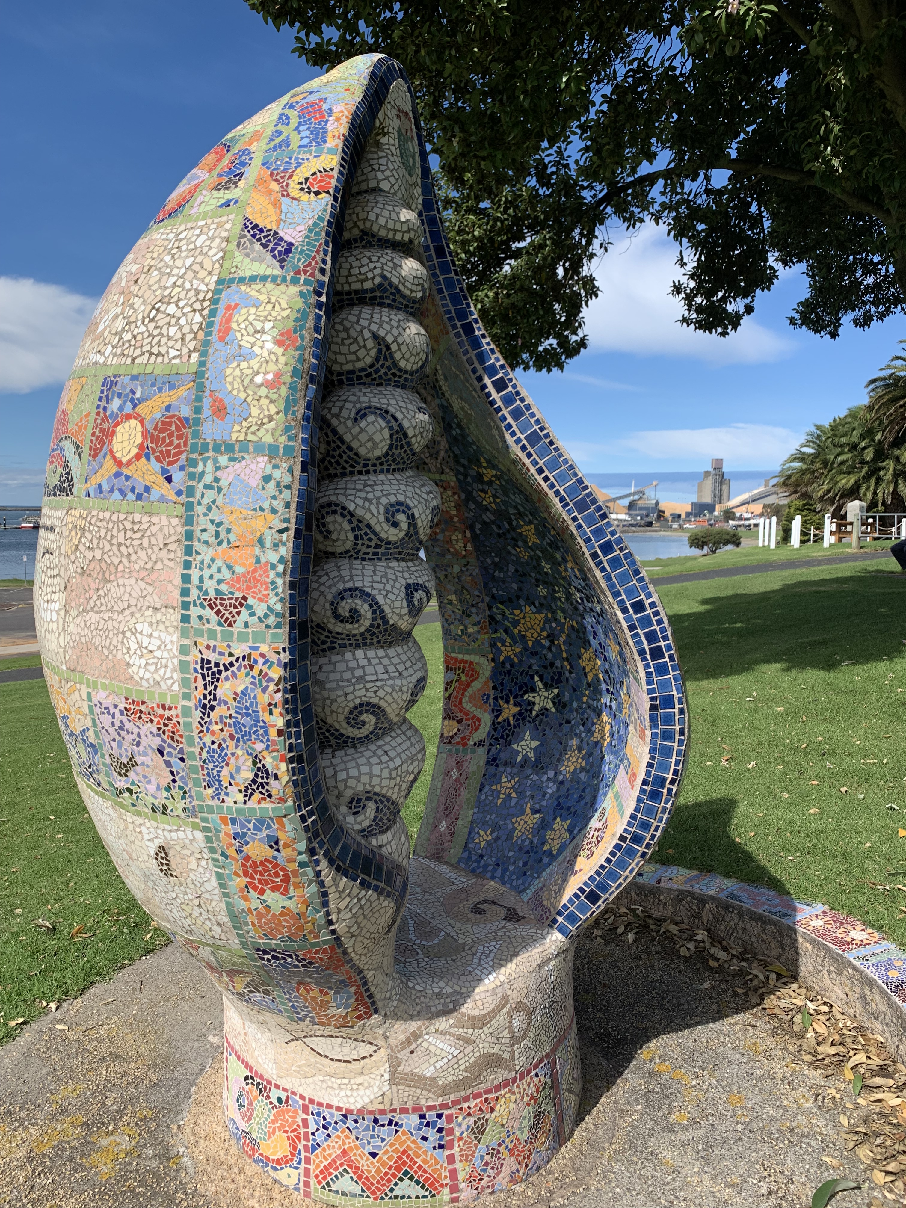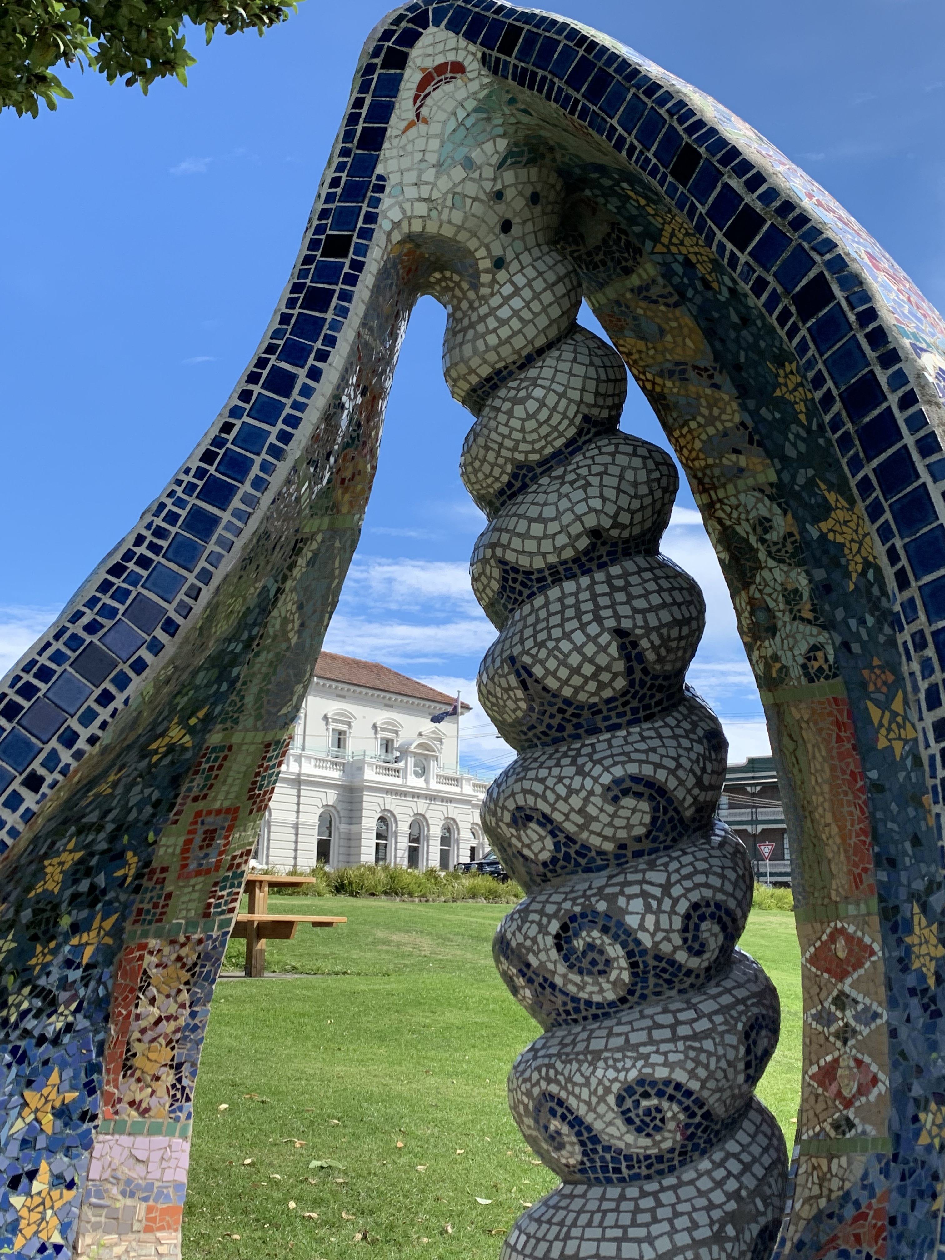 Yet, down on the foreshore is a mosaicked throne worthy of a mermaid queen. Rolling shell-like curves dance with pattern and call to come and sit a spell.